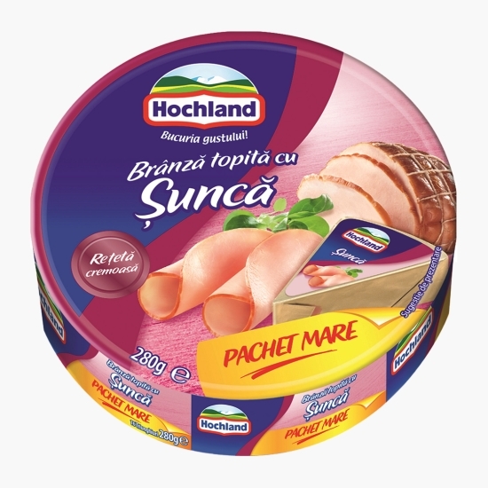 Brânza topită triunghiuri cu șuncă Hochland pachet mare, de 280g, pentru întreaga familie, conține 16 porții cremoase, perfecte pentru micul dejun și sandvișurile întregii familii. Gusturi minunate pentru dimineți animate și poftă de varietate. Încearcă-le pe toate: triunghiurile de brânză topită Hochland cu smântână sau cașcaval, precum și combinațiile delicioase și variate, pentru toate gusturile, din gama Mixtett.