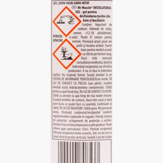 Poate fi coroziv pentru metale. Provoacă arsuri grave ale pielii şi lezarea ochilor. Foarte toxic pentru mediul acvatic cu efecte pe termen lung. Dacă este necesară consultarea medicului, ţineţi la îndemână recipientul sau eticheta produsului. A nu se lăsa la îndemâna copiilor. Nu inspiraţi fumul. Sunați imediat la un CENTRU DE INFORMARE TOXICOLOGICĂ/un medic. ÎN CAZ DE CONTACT CU PIELEA (sau părul): scoateți imediat toată îmbrăcămintea contaminată. Clătiți pielea cu apă/faceți duș. ÎN CAZ DE CONTACT CU OCHII: Clătiți cu atenție cu apă timp de mai multe minute. Scoateți lentilele de contact, dacă este cazul și dacă acest lucru se poate face cu ușurință. Continuați să clătiți. ÎN CAZ DE ÎNGHIȚIRE: Clătiți gura. NU provocați voma. Eliminaţi conţinutul/recipientul conform regulamentelor naționale în vigoare. Purtaţi mănuşi de protecţie/ echipament de protecţie a ochilor. Atenţie! A nu se folosi împreună cu alte produse. Poate elibera gaze periculoase (clor).