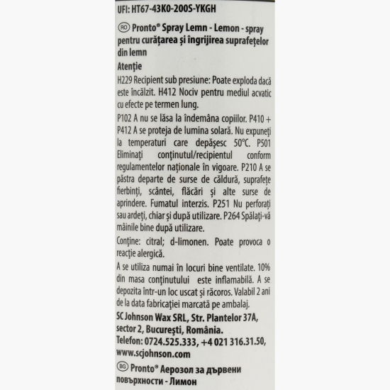 | Informații producător | Pronto Aerosol Lemn Lemon 300ml;SC Johnson Wax SRL;Str. Plantelor 37A, sector 2, Bucureşti, România. Telefon: +4 021 316.31.50. |
