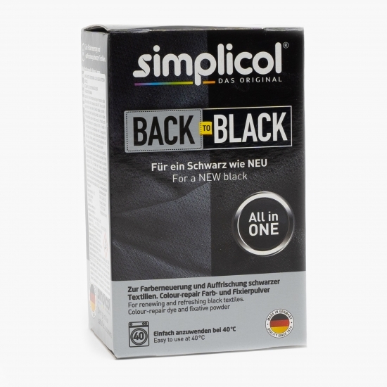 Vopsea pentru reînnoirea culorii negre în mașina de spălat. Utilizare simplă și curată în mașina de spălat la 40°, într-un ciclu de spălare pentru un negru intensiv.