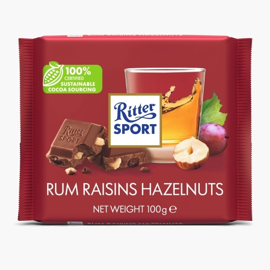 Ritter Sport Rum Raisins Hazelnuts oferă aroma deosebită a stafidelor californiene marinate ore întregi în rom jamaican.