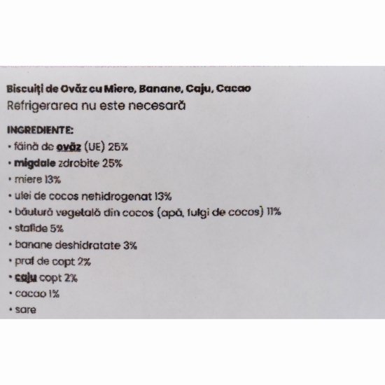 Culoarea vine de la pudra de cacao alcalinizată, iar dulcele de la banana chips, stafidele de Corint și un strop de miere de la un producător mic din România. Pentru un plus de crunch s-a adăugat caju care este mai întâi rumenit în cuptor.