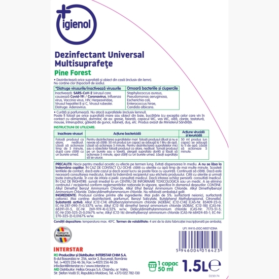 Igienol dezinfectant universal Pine Fresh este special conceput pentru dezinfectare și curățenie, fără clor (hipoclorit de sodiu).