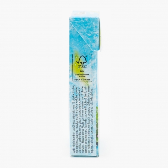 Fiecare drops Ricola conține un amestec de 13 plante atent cultivate în munții Elveției după standardele de agricultură ecologică ale acestei țări.