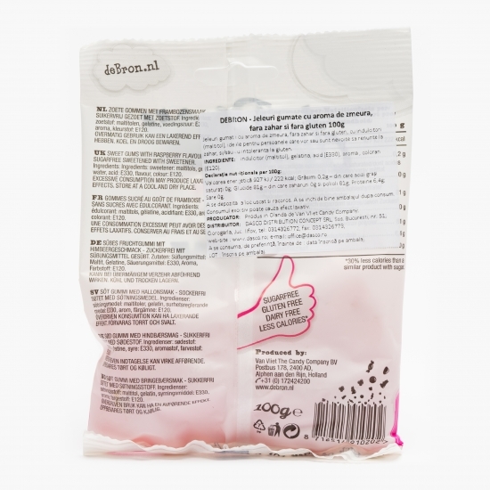 Jeleuri gumate Debron cu aromă de zmeură, fără zahăr și fără gluten, cu îndulcitori (maltitol), ideale pentru persoanele care vor sau sunt nevoite să renunțe la zahăr și/sau cu intoleranță la gluten.