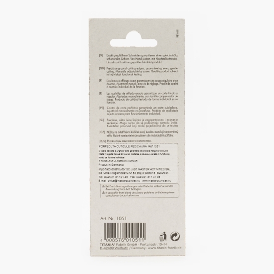 | Informații producător | TITANIA Forfecuta cuticule pedichiura, 1buc;TITANIA;Fortunastraße 10 - 14, 42489 Wülfrath, Germany |