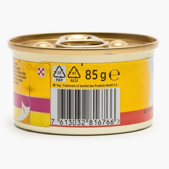 Bucăți fragede combinate cu bucățele subțiri, gătite cu atenție: combinația ideală între două texturi diferite la aceeași masă pentru a oferi pisicii tale plăcerea unui amestec subtil de gusturi și texturi.
