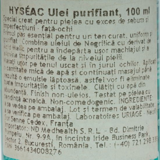 Uleiul de curățare Hyseac de la Uriage este o emulsie lăptoasă care curăță blând, îndepărtează machiajul (chiar și pe cel rezistent la apă) și impuritățile de pe piele, fără a lăsa reziduuri grase.Lasă pielea proaspătă și curată, porii sunt curățați în profunzime și excesul de sebum este redus.