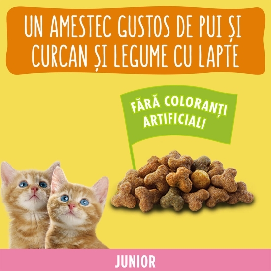 Hrană uscată pentru pisici junior, cu pui, curcan, lapte și legume, 1.5kg