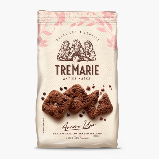Biscuiți delicioși cu cacao neagră, îmbogățiți cu fulgi extra de ciocolată neagră.