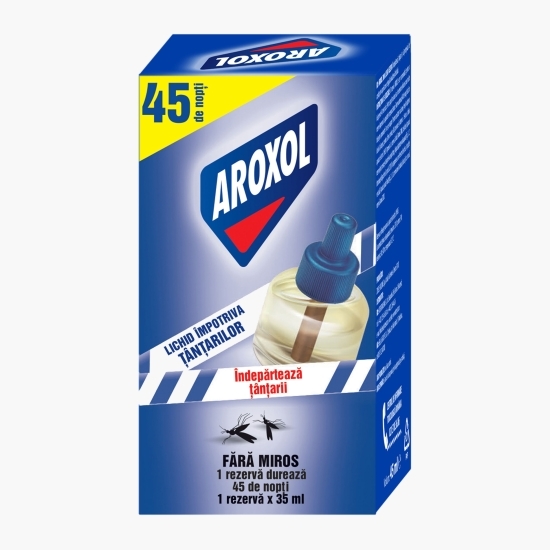Rezerva lichidă utilizată împreună cu aparatul electric Aroxol dual system (pentru pastile și lichid), vă va proteja timp de 8-10 ore pe noapte într-o cameră de 30 metri cubi, cu pauză de minim 2 ore între utilizări. Pentru o protecție mai bună în încăperi mai mari utilizați mai multe unități de vaporizare.