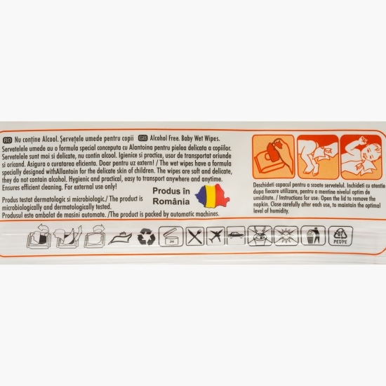 Șervețelele umede au o formulă special concepută cu Alantoină pentru pielea delicată a copiilor.