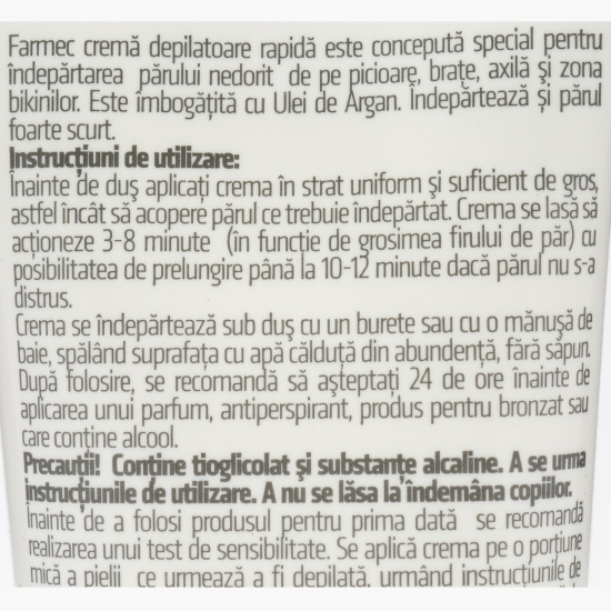 Farmec cremă depilatoare rapidă este concepută special pentru îndepărtarea părului nedorit de pe picioare, braţe, axilă şi zona bikinilor.