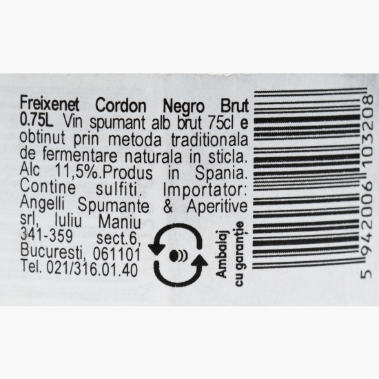Cordon Negro Brut este emblematic pentru Freixenet în ceea ce privește vinurile spumante. Cu o istorie de peste 150 de ani, acest vin este produs precum șampania, ocazie cu care dobândeşte o aromă unică, inconfundabilă. Realizat dintr-un blend de trei soiuri de struguri, Cordon Negro Brut împrumută aromele fructate și aciditatea soiului Macabeu, puterea și profunzimea soiului Xarel-lo și eleganța specifică soiului Parellada. Producția începe prin culegerea manuală a strugurilor, iar acest proces se întinde pe câteva luni pentru a asigura perioada perfectă pentru fiecare soi. Fermentația se produce în recipiente din oțel inoxidabil, iar al doilea proces de fermentare are loc în sticlele Cordon Negro, în condiții speciale de depozitare în cramă pe o perioadă de 18 luni. Astfel se conturează aroma perfect echilibrată a expresiei Freixenet Cordon Negro Brut, care dezvăluie cu o eleganţă deosebită accente de mere, pere și citrice, rezultatul fiind un vin spumant ce poate fi potrivit la orice. Unde mai pui că vinul vine îmbuteliat într-o sticlă de o eleganță aparte, cu accente negre și aurii.