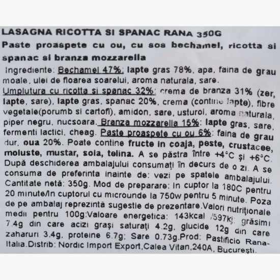 Această lasagna Rana conține brânză ricotta, sos bechamel, spanac, proporționate echilibrat în 350g.