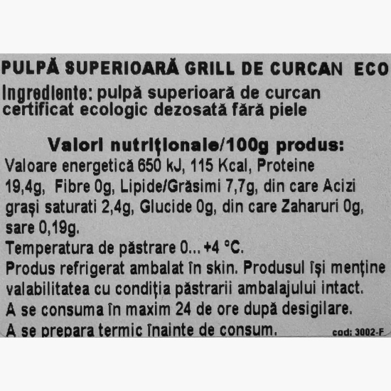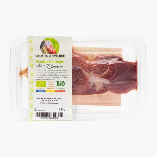 Pulpa superioară de curcan provine din carnea curcanilor crescuți ecologic, fără ingrediente artificiale, hormoni, antibiotice, organisme modificate genetic.