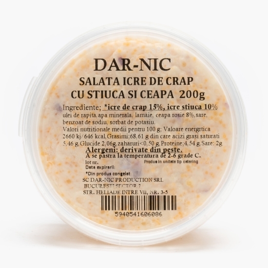 Salata de icre Dar-Nic este realizată dintr-o generoasă porție de icre de crap și știucă, ulei, lămâie, ceapă.
