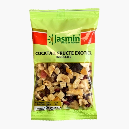 Cocktail mix de fructe exotice Jasmine ce conține: ananas deshidratat, banane deshidratate, stafide deshidratate, papaya deshidratată, mango deshidratat.