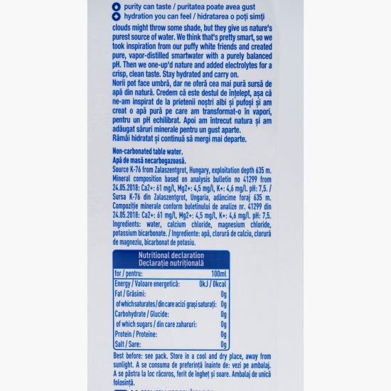 Inspirată din secretul norilor, Smartwater este creată printr-un proces inteligent de evaporare și condensare a apei minerale naturale, la care se adaugă cantitatea potrivită de săruri minerale pentru același gust aparte, pur și proaspăt de fiecare dată.