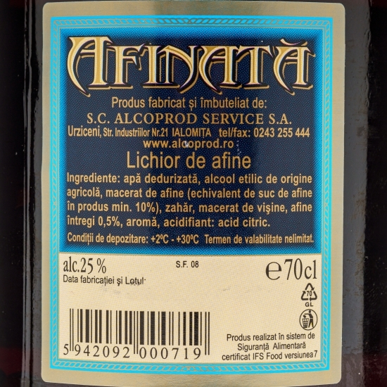 Afinata Vox Maris 25% este un lichior obținut prin metodă tradițională, respectiv amestecarea afinelor sălbatice cu zahăr, urmată de adăugarea alcoolului etilic după câteva zile.