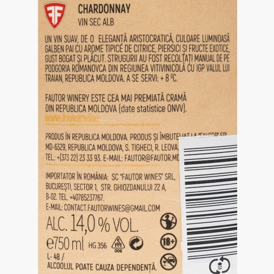 Vinul alb sec Chardonnay Aurore de la Fautor este un vin suav, de o eleganță aristocratică, realizat din struguri din soiul Chardonnay, recoltați manual de pe podgoria Romanovca din regiunea vitivinicolă cu IGP Valul lui Traian.