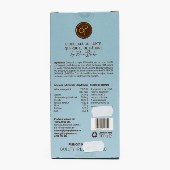 Ciocolata de la Guilty Pleasure este un adevărat deliciu artizanal, creată cu pasiune și ingrediente de cea mai înaltă calitate. Ciocolata catifelată cu lapte și fructele de pădure dulci-acrișoare fac un pas de deux delicat, cu un gust irezistibil.