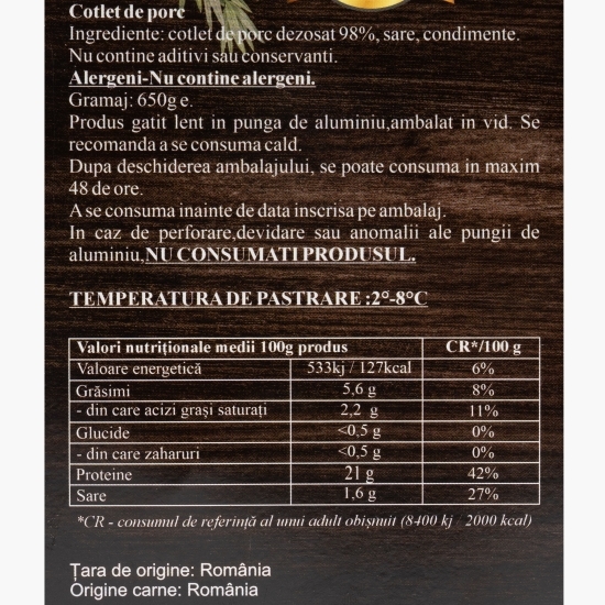 Cotletul de porc este gătit lent după o rețetă atent selecționată, fără aditivi și fără alergeni, utilizând o tehnologie de ultimă generație și oferind o experiență culinară deosebită.