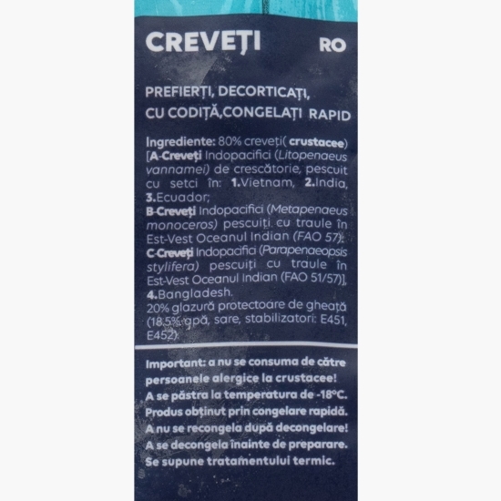 Creveţii OceanFish prefierți, glazură 20% provin din fermele ecologice din Vietnam sau India.