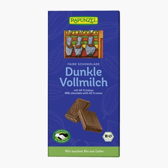 Ciocolata neagră eco cu lapte integral 46% cacao de la Rapunzel îmbină intensitatea ciocolatei negre cu finețea laptelui integral. Cu ingrediente ecologice atent selecționate, oferă un echilibru perfect între aromă și cremozitate.