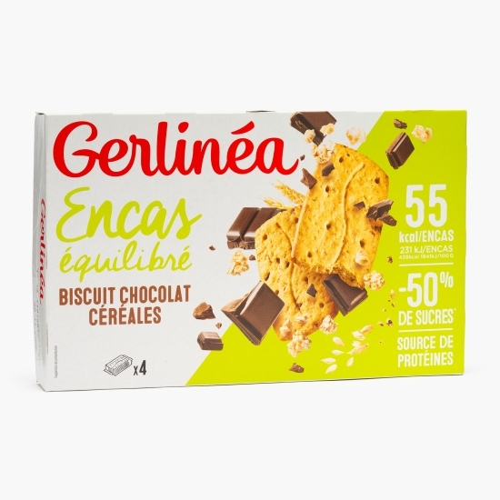 Biscuiții proteici cu ciocolată și cereale de la Gerlinea sunt ideali pentru o alimentație echilibrată și o dietă săracă în calorii. Ambalați în 4 pachete a câte 4 biscuiți fiecare, aceștia conțin doar 55 kcal per biscuit, cu 46% mai puține zaharuri.