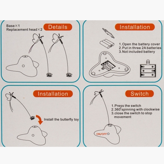 Este formată dintr-un stativ stabil și o tijă flexibilă, prevăzută cu un fluturaș colorat, care se rotește în jurul bazei, imitând mișcarea unui adevărat fluture. Pisica se va bucura să alerge, să prindă și să se joace.