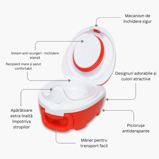 Mâner pentru transport, conceput pentru a încuraja consecvența. Antrenament la oliță oriunde, simplu și fără stres! Sistem revoluționar anti-scurgeri care oferă închidere etanșă – fără mizerie, mereu! Design adorabil și culori atracti