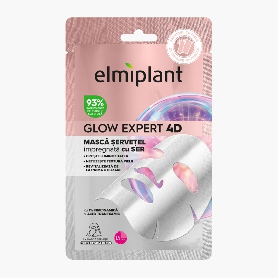 Masca șervețel Glow Expert 4D Șervețel, impregnată cu ser, oferă o experiență completă de îngrijire, revitalizare și iluminare a pielii, cu 93% ingrediente de origine naturală.