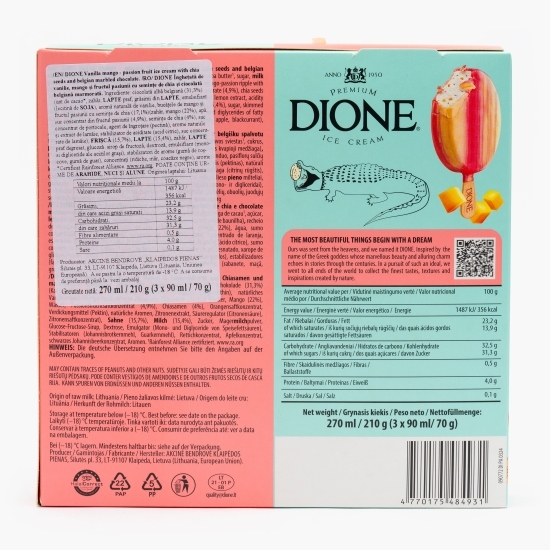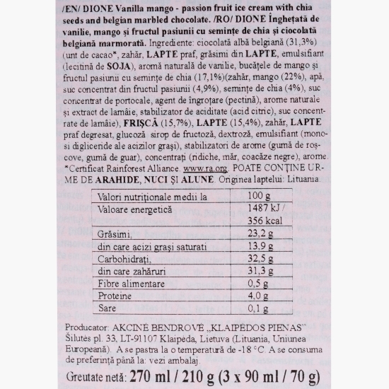 Înghețată de vanilie, mango și fructul pasiunii, cu semințe de chia și ciocolată belgiană marmorată, 3x90ml (3x70g)
