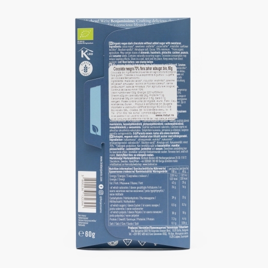 Descoperă ciocolata eco Benjamissimo cu 70% cacao, fără zahăr adăugat, pentru un gust intens și natural. Masa de cacao premium, combinată cu îndulcitor natural erythritol, oferă o dulceață subtilă, perfectă pentru cei care doresc o ciocolată bogată și sănătoasă.