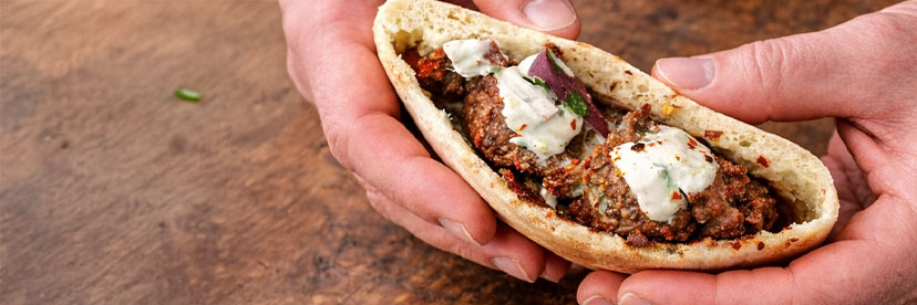 Când este gata kebab-ul, putem să-l montăm în lipie, cu sos și cu salată de ceapă. Putem să îl servim și în farfurie, alături de legume le coapte, în funcție de preferințe.