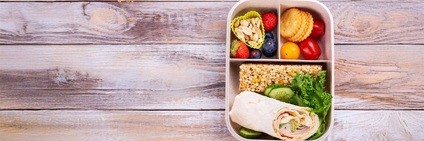 Plasăm wrap-ul tăiat în caserolă, pe o frunză de salată și felii de castravete. În alt compartiment punem afinele, căpșunele și alunele, apoi adăugăm biscuiții, roșiile și batonul de cereale.