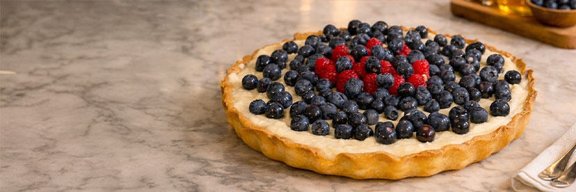 Scoatem blatul de tartă de la cuptor, îl lăsăm să se răcească complet, îl umplem cu cremă, adăugăm ce fructe dorim pe deasupra și tarta este gata de servit.